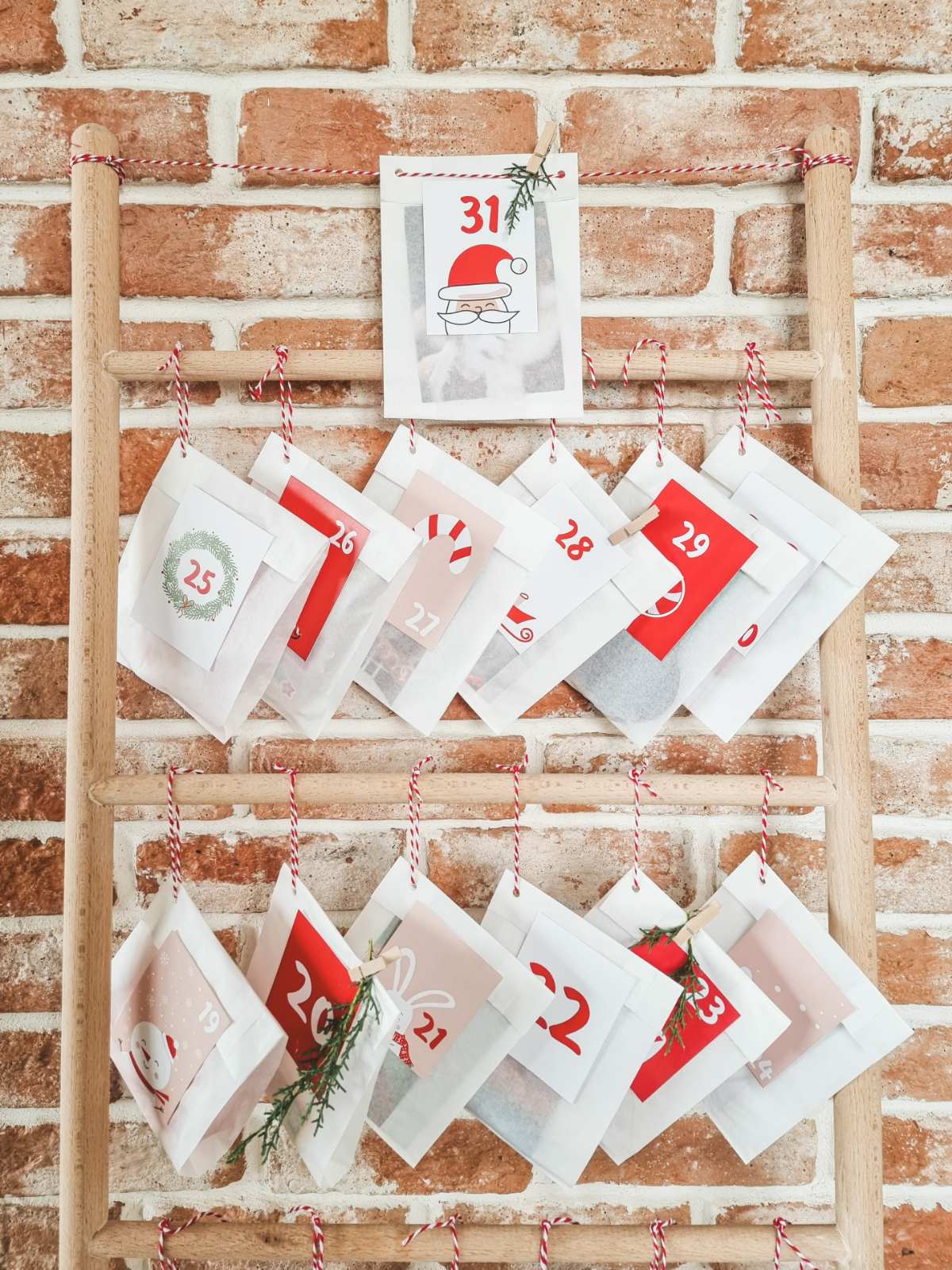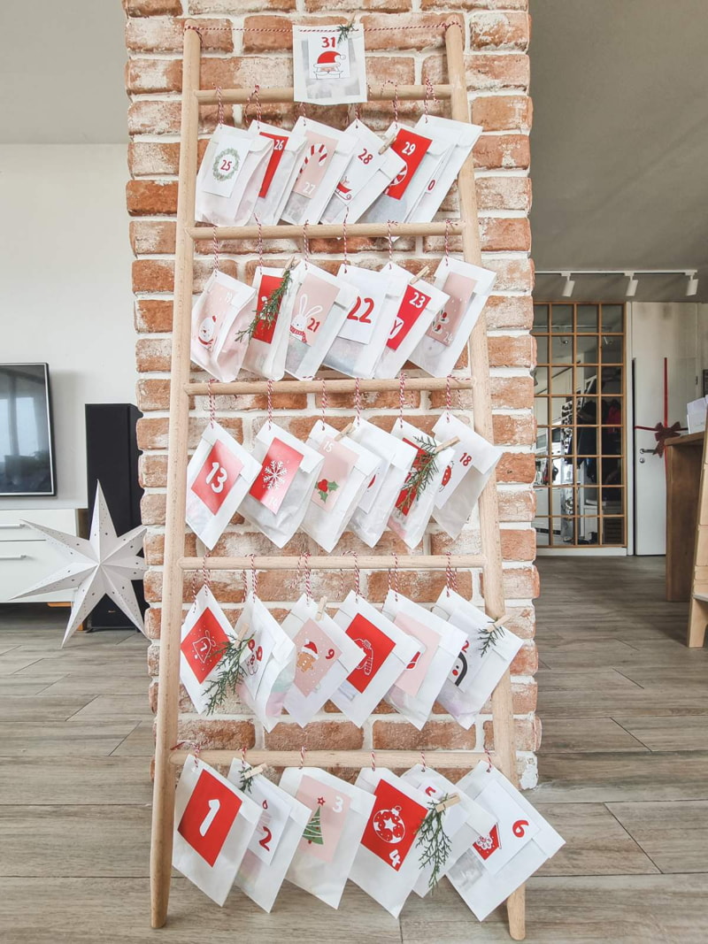 Хартиените кеси ги полните со подарочиња, картички, алатки за активности. Ја затворате кесата и одозгора ја лепите картичката со бројка. Правите дупче со перфоратор и протнувате врвца за да може да ги закачите кесите. За закачување јас имав една дрвена украсна скала па кесите ги врзав на нив. Како алтернатива може да искористите гранка од дрво или пак само да ги наредите во некоја кутија. Дури можете секој ден да оставате само по една кесичка по елка, а останатите да ги чувате настрана. Ова е посебно згодно кога имате мали нестрпливи дечиња. Искрено јас не знам дали Зои ќе издржи да отвораме по една кесичка дневно. Можно е еден ден да се вратам од работа и да ги начекам сите поклони отворени, а таа ушлапана во чоколадо 🙂 🙂 🙂