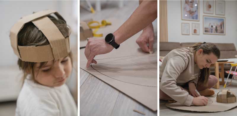 Од картонот се сече лента со широчина од 4 см доволно долга да може да ја завиткате околу главата на детето. Користејќи ја главата на вашето дете како водич, залепете ги краевите на картонот, додавајќи 3 см дополнителен простор за да се залепи белата ткаенина. Следно, исечете и залепете две дополнителни ленти од 4 см и прекрстете ги преку горниот дел од главата во форма Х. Прицврстете ги краевите со лепакВеќе ја имате направено внатрешноста на шеширот.