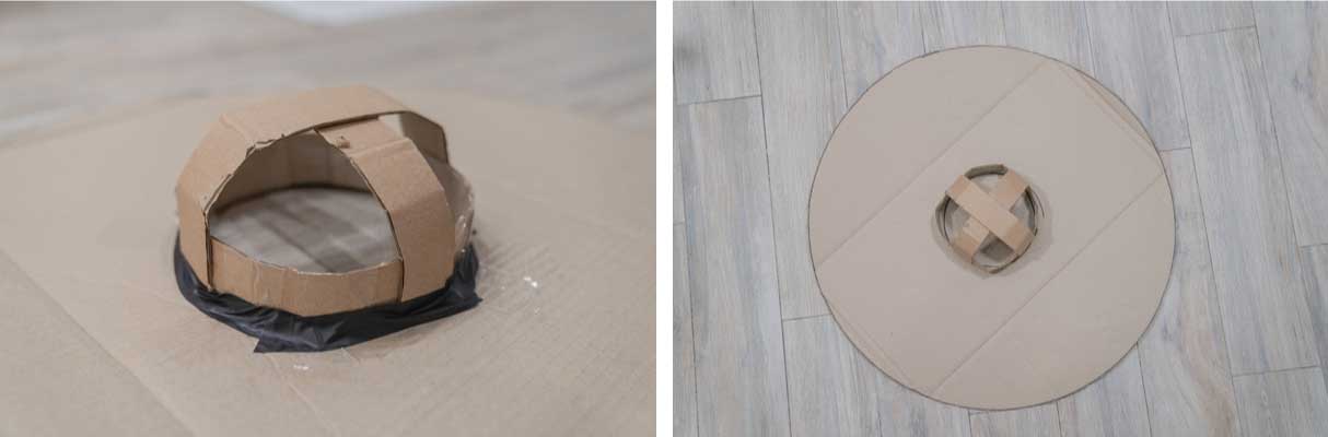 Користејќи големо парче цврст картон, исцртајте кружен круг со дијаметар од околу 55 см. Исечете го кругот. Следно, во средината на картонот поставете ја капата која петходно ја направивте во чекор 1 и со молив исцртајте го кругот. Потоа исечете ја дупката.